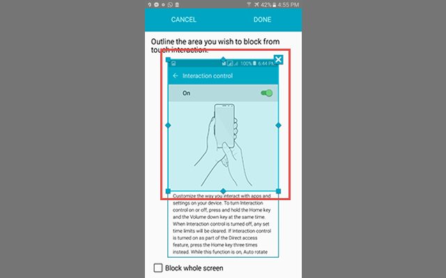 ستظهر لك شاشة لتحديد المنطقة التي تريد منع اللمس فيها حيث يمكنك تحد جزء منها أو كلها
